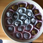 Voor de verjaardag van 2 bevriende lekkerbekken eens wat anders verzonnen. Homemade bonbons voor ieder in een kistje. Eerder gezegd dan gedaan, vooral als het buiten 30 graden is…….Je moet er wel de tijd voor nemen maar het resultaat is een apart cadeautje! Het was best een geklieder maar ik ben best tevreden met het resultaat.